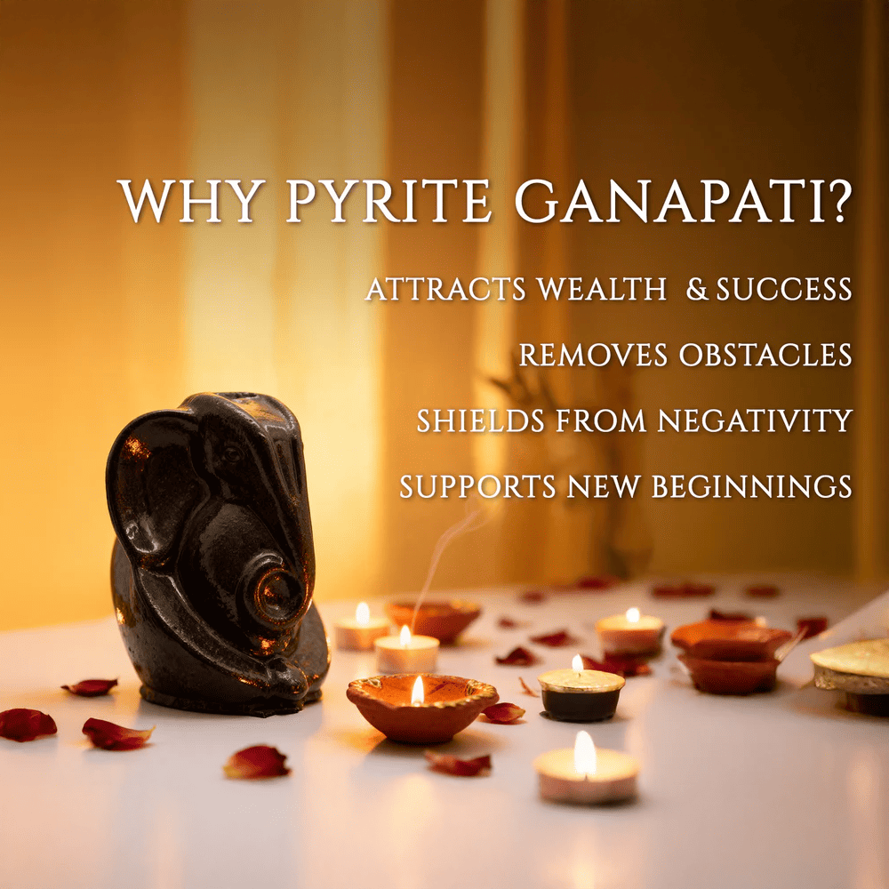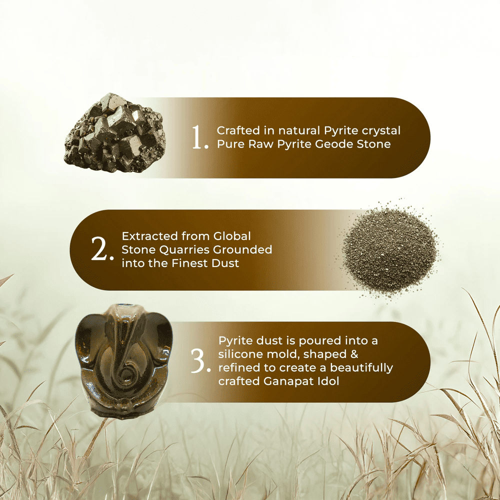 This exquisite Pyrite Ganapati is blessed at the revered Chintaman Ganesh Temple, Ujjain, and crafted from natural Pyrite crystal. Each idol is formed from pure Pyrite geode stone, carefully processed and shaped into a detailed Ganapati murti. Ideal for home, office, or gifting, it is believed to attract wealth, remove obstacles, protect from negativity, and support positive new beginnings.